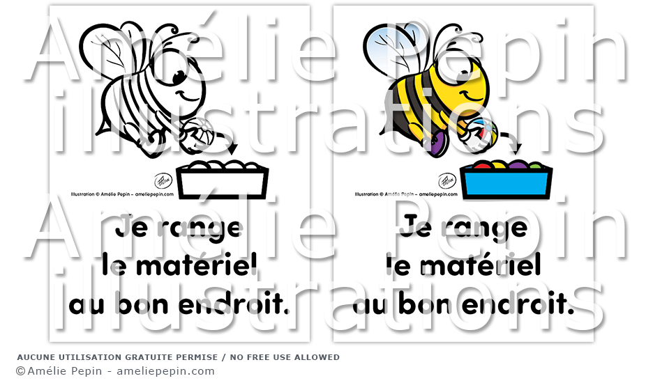 Règle de classe illustrée avec une abeille: "Je range le matériel au bon endroit."