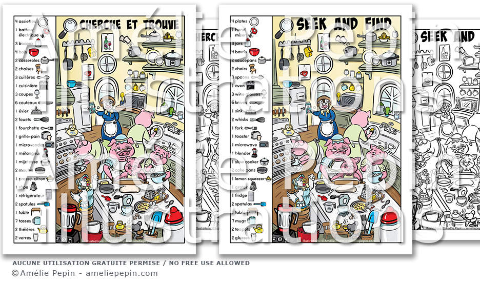 L'enfant cherche et trouve les éléments de la liste dans l'illustration. Les éléments à découvrir sont illustrés pour aider l'enfant à apprendre leur nom. C'est un jeu qui développe le sens de l'observation, la concentration et le vocabulaire. L'enfant compte également les éléments jusqu'à sept. Dans cette image, les cochons cuisinent avec leurs amis pour vous faire découvrir les différents accessoires de cuisine. Une version en noir et blanc est incluse et n'attend qu'à être coloriée!