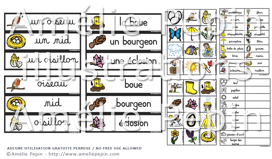 Les mots illustrés sont: printemps, saison, pluie, imperméable, parapluie, botte de pluie, boue, bourgeon, éclosion, fleur, tulipe, jonquille, pissenlit, lilas, graine, oiseau, nid, oisillon, œuf, papillon, soleil, fondre, semer, sauter, Pâques, poisson d'avril, temps des sucres.