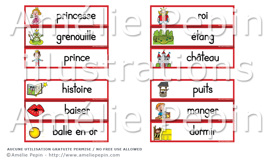 Les mots illustrés sont: princesse, grenouille, prince, roi, étang, château, histoire, baiser, balle en or, puits, manger, dormir.