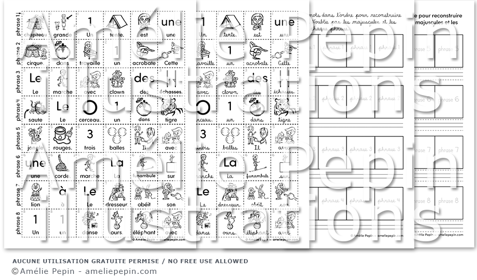 L'enfant découpe les mots illustrés de la page 3 du document (une rangée correspond à une phrase). Il replace les mots en ordre pour former une phrase et il les colle dans les carrés aux pages 1 et 2. Il peut ensuite écrire les phrases obtenues dans les trottoirs (écriture script) ou dans les lignes doubles (écriture cursive). Dans chaque phrase, la lettre majuscule et le point sont indiqués sur les images afin d'aider l'enfant. Les phrases contiennent 6 mots.