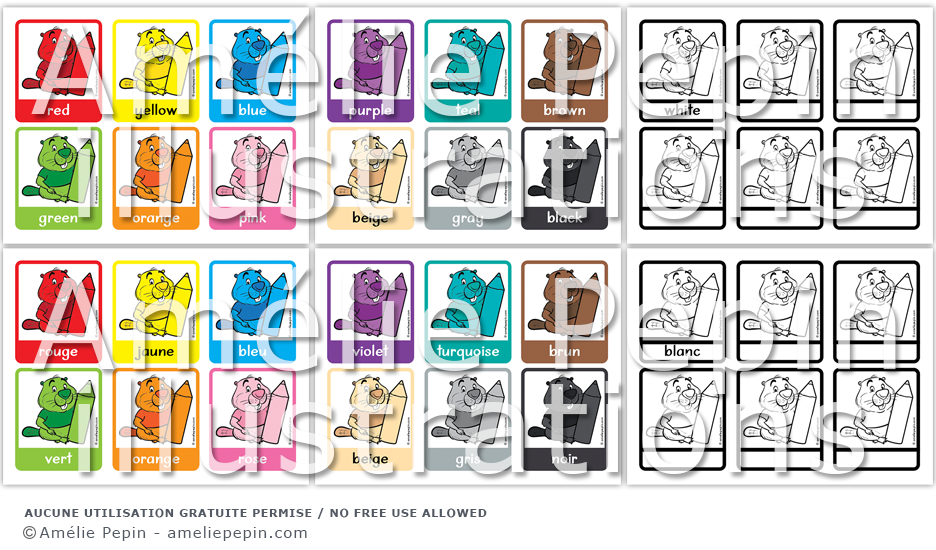 Les couleurs illustrées avec un castor qui tient un crayon sont: jaune, bleu, rouge, vert, orange, rose, violet, turquoise, brun, beige, gris, noir et blanc. Si vous séparez votre groupe en plusieurs équipes de couleurs différentes, vous pouvez utiliser ces affichettes pour les identifier. Chaque carte mesure environ 3 po X 3 1/2 po. La dernière page du document contient le blanc ainsi que 5 autres castors à colorier (cela vous permet d'ajouter d'autres couleurs au besoin).