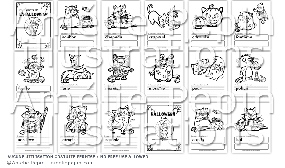 Dans ce cahier, l'enfant s'exerce à colorier et à écrire les mots suivants: bonbon, chapeau, crapaud, citrouille, fantôme, feuille, lune, momie, monstre, peur, potion, sorcière, vampire et zombie.