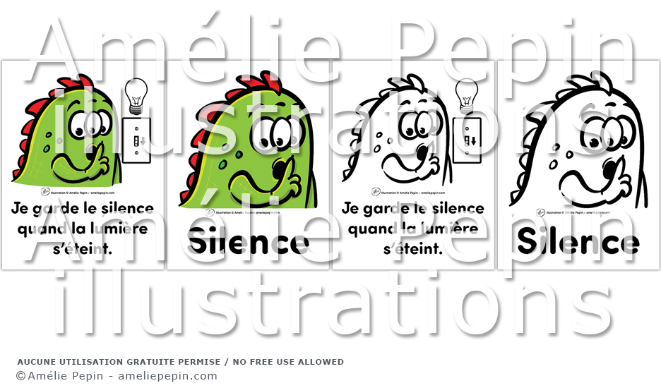 Règles de classe illustrées avec des monstres: "Silence" et "Je garde le silence quand la lumière s'éteint."