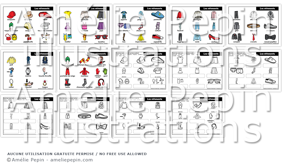 Imagier sur le thème des vêtements. Le dossier contient 7 affiches et 7 feuilles d'activités pour apprendre le vocabulaire en lien avec les vêtements et accessoires. Dans les activités, l'enfant écrit les mots demandés au bon endroit.