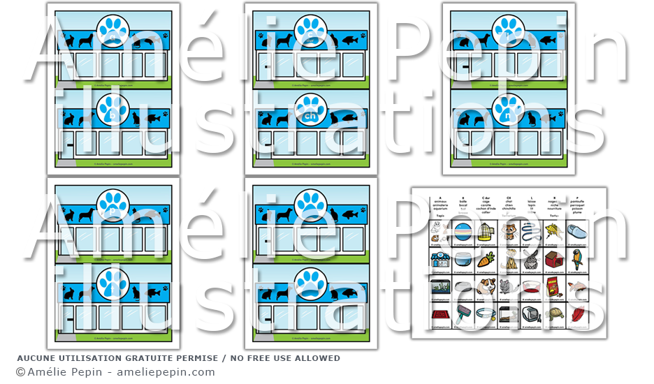 Chaque animalerie contient un son vedette (A, B, C dur, CH, L, N, P, T). L'enfant place trois ou quatre images sur les fenêtres de l'animalerie dont le nom débute par la lettre vedette. Par exemple, pour la lettre B, l'enfant place les images: balle, bocal, bol, brosse. Certaines images peuvent être placées à différents endroits selon le mot perçu par l'enfant, il est donc important de lui demander le nom de l'image si vous ne les mentionnez pas. La liste des mots est inscrite sur la page d'illustrations.