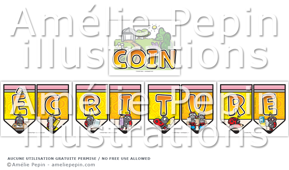 Créez un bel affichage pour votre coin écriture avec cette banderole illustrée avec des coccinelles. Chaque page contient deux fanions en forme de crayon. Chaque fanion mesure environ 7,5 po de hauteur sur 4,9 po de largeur. Découpez chaque lettre et collez-les à votre mur, ou encore, conservez une bande blanche au-dessus du fanion lorsque vous découpez ceux-ci pour pouvoir plier cette partie sur une corde à suspendre. De plus, une page contient le mot "coin" à découper en un seul morceau.