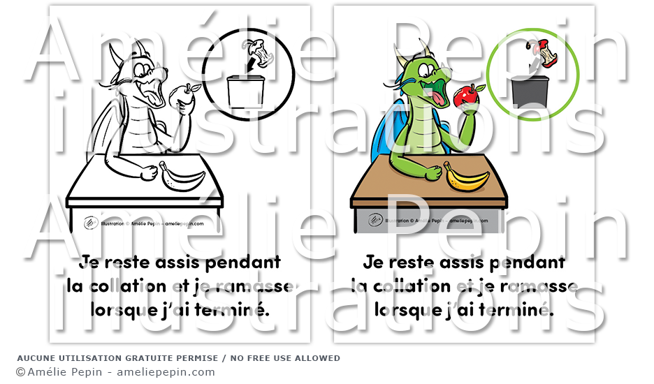 Règle de classe illustrée avec un dragon: "Je reste assis pendant la collation et je ramasse lorsque j'ai terminé."