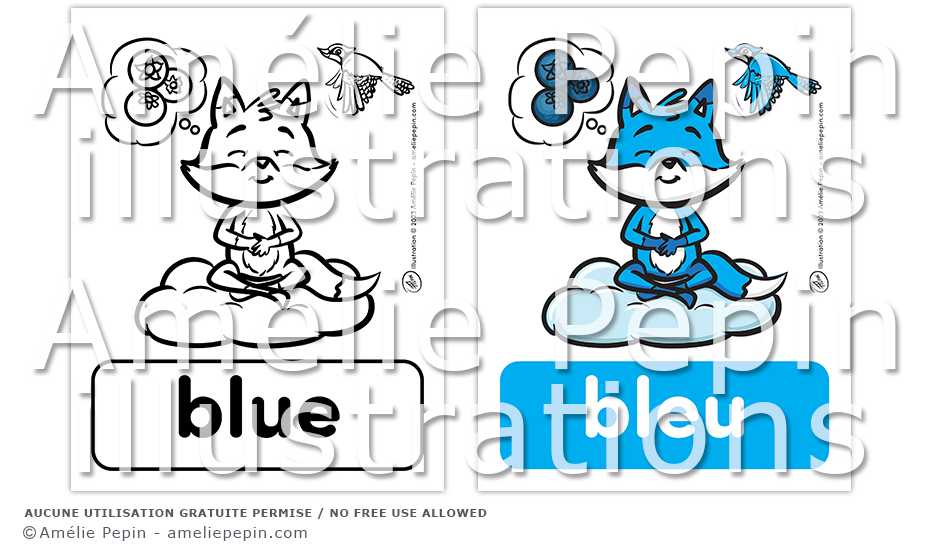Sur cette affiche, un renard est entouré d'éléments de couleur bleue: nuage (ciel), bleuets, geai bleu. Une version à colorier de l'affiche est également incluse pour apprendre la couleur.