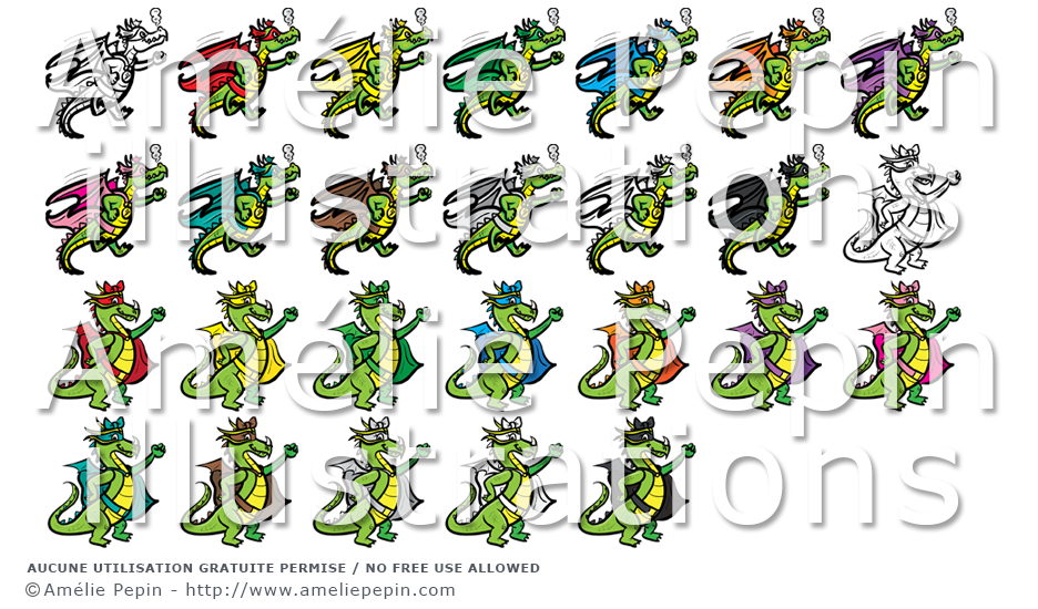 Ce dossier contient des images de dragons (garçons et filles) en superhéros de différentes couleurs: rouge, jaune, vert, bleu, orange, violet, rose, turquoise, brun, gris, noir et blanc.