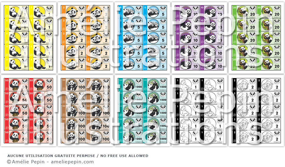 Ces documents contiennent les billets de 1$, 2$, 5$, 10$, 20$, 50$,100$ et 1000$. Sauvez de l'encre en imprimant la version en noir et blanc sur du papier teinté.