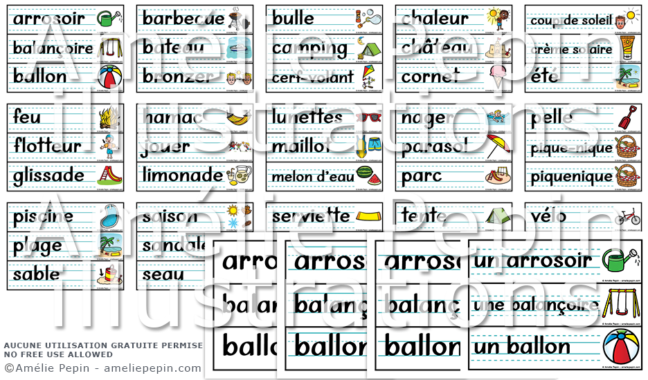 Les mots illustrés sont: arrosoir, balançoire, ballon, barbecue, bateau, bronzer, bulle, camping, cerf-volant, chaleur, château, cornet, coup de soleil, crème solaire, été, feu, flotteur, glissade, hamac, jouer, limonade, lunettes, maillot, melon d'eau, nager, parasol, parc, pelle, pique-nique (piquenique), piscine, plage, sable, saison, sandale, seau, serviette, sucette glacée, tente, trampoline, vacances, vélo, voyage.