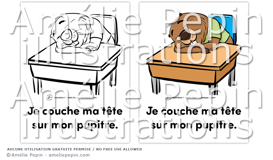 Règle de classe illustrée avec un castor: "Je couche ma tête sur mon pupitre."