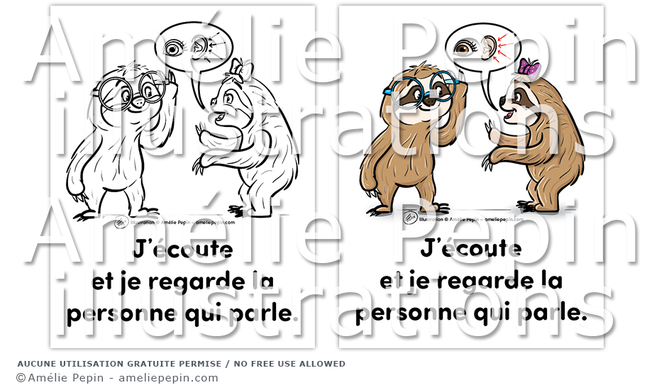 Règle de classe illustrée avec des paresseux: "J'écoute et je regarde la personne qui parle."