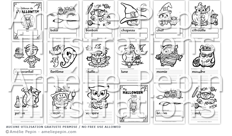 Dans ce cahier, l'enfant s'exerce à colorier et à écrire les mots suivants: balai, bonbon, chapeau, chat, citrouille, épouvantail, fantôme, feuille, lune, momie, monstre, potion, sorcière et vampire.