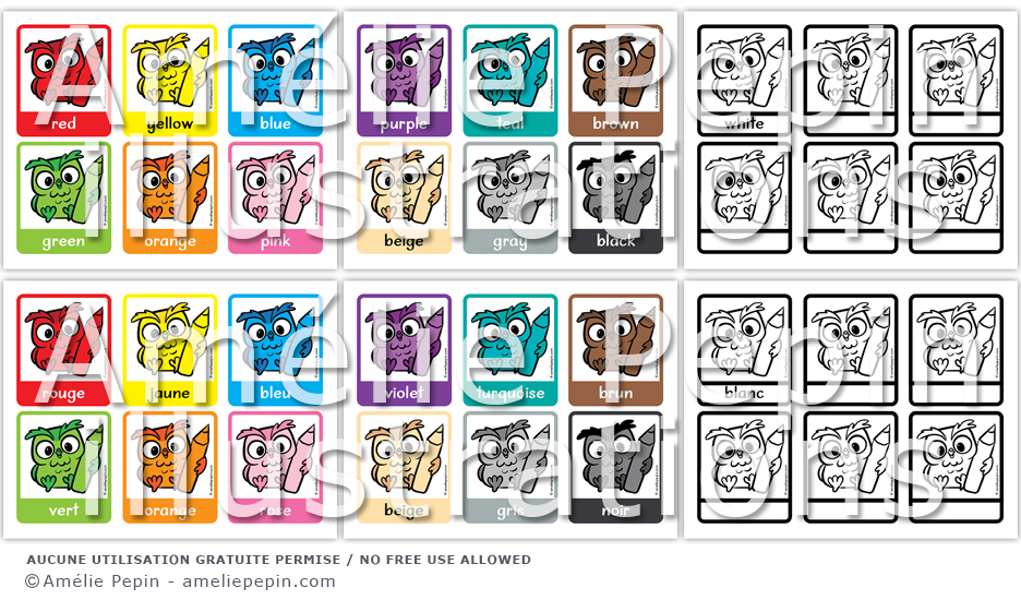 Les couleurs illustrées avec un hibou qui tient un crayon sont: jaune, bleu, rouge, vert, orange, rose, violet, turquoise, brun, beige, gris, noir et blanc. Si vous séparez votre groupe en plusieurs équipes de couleurs différentes, vous pouvez utiliser ces affichettes pour les identifier. Chaque carte mesure environ 3 po X 3 1/2 po. La dernière page du document contient le blanc ainsi que 5 autres hiboux à colorier (cela vous permet d'ajouter d'autres couleurs au besoin).
