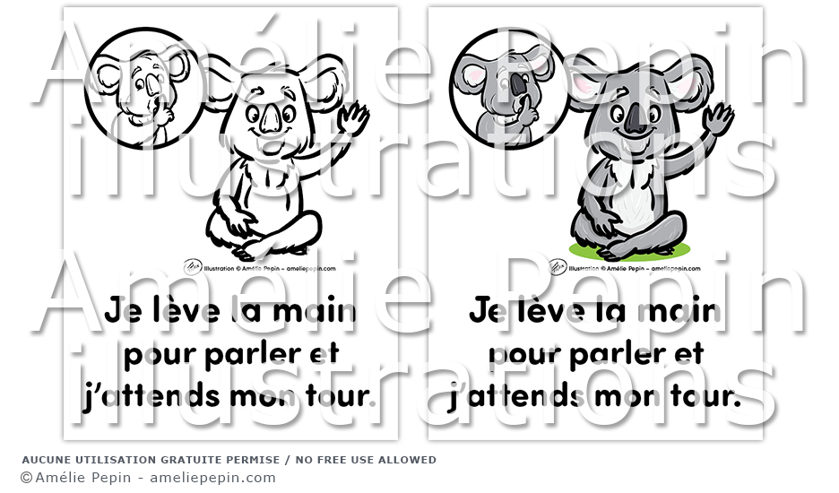 Règle de classe illustrée avec des koalas: "Je lève la main pour parler et j'attends mon tour."