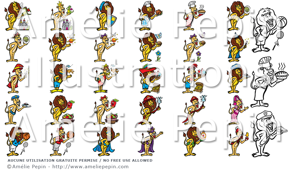Ce dossier contient des images de lions pour illustrer les thèmes suivants: les châteaux, l'alimentation, les dinosaures, l'espace et les planètes, les insectes, la magie, la mer, les pirates, la sécurité (policiers), les pommes, les pompiers, les sports, les superhéros et le temps des sucres.
