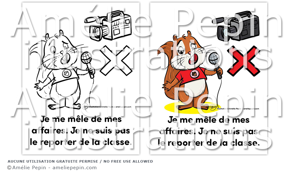 Règle de classe illustrée avec un écureuil: "Je me mêle de mes affaires. Je ne suis pas le reporter de la classe."