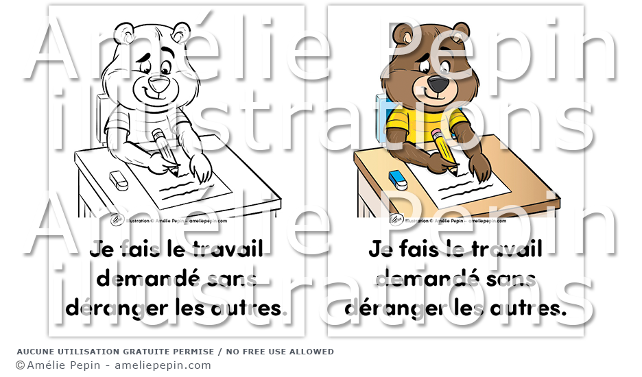 Règle de classe illustrée avec un ours: "Je fais le travail demandé sans déranger les autres."