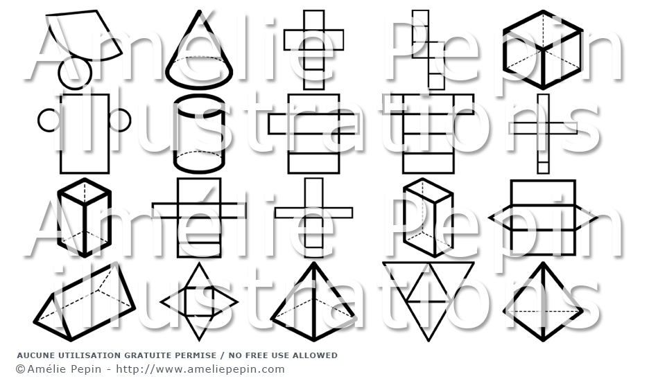 Le dossier contient les solides suivants: cône, cylindre, pyramide à base carrée, pyramide à base triangulaire, cube, prisme à base carrée, prisme à base rectangulaire, prisme à base triangulaire.