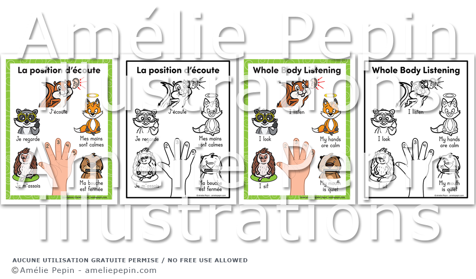 Affiches qui illustrent la position d'écoute avec des animaux de la forêt. Chaque fichier contient une affiche par page, deux affiches par page et quatre affiches par page. Versions en couleurs et en noir et blanc offertes.