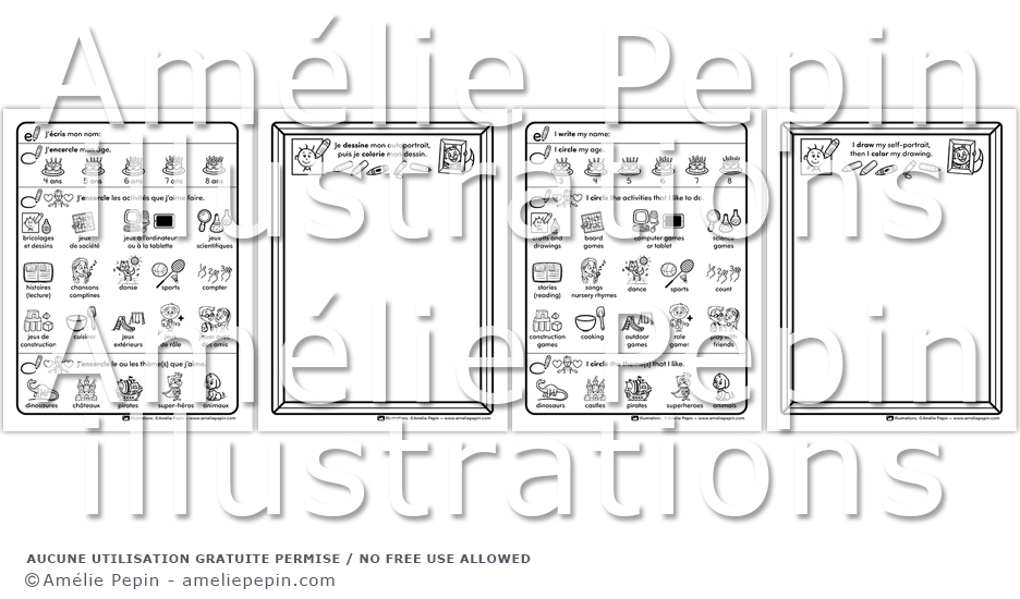Voici une fiche illustrée qui vous aide à connaitre vos élèves en début d'année scolaire. L'enfant écrit son nom, il encercle son âge (3 à 8 ans), il encercle aussi les activités et les thèmes qu'il aime. Au verso (page 2), l'enfant dessine son autoportrait, puis le colorie.