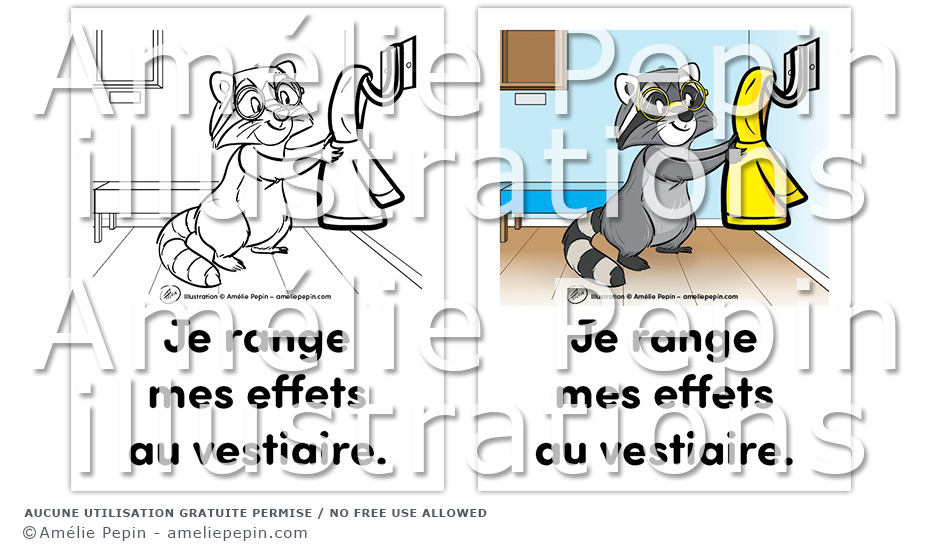 Règle de classe illustrée avec un raton laveur: "Je range mes effets au vestiaire."