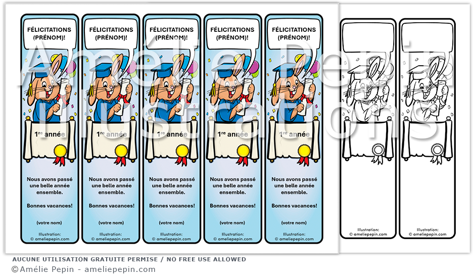 Signets aux coins arrondis illustrés avec un lapin très heureux d'avoir obtenu son diplôme de fin d'année scolaire.