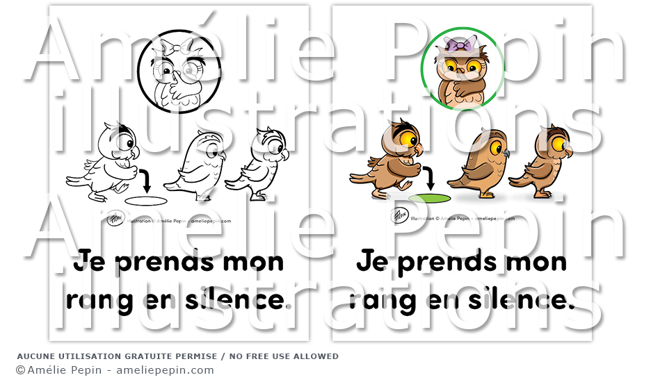 Règle de classe illustrée avec des hiboux: "Je prends mon rang en silence."