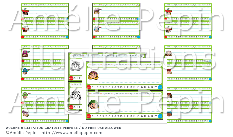 Chaque étiquette contient les lettres de l'alphabet en cursive avec les voyelles écrites en rouge, un trottoir pour écrire le prénom de l'enfant, les nombres de 0 à 20 ainsi que la gauche et la droite. Dans la seconde version, l'enfant peut colorier son pirate. La version PowerPoint vous permet d'écrire les prénoms des élèves à l'ordinateur. Vous devez toutefois avoir installé le logiciel PowerPoint sur votre appareil pour ouvrir le document.
