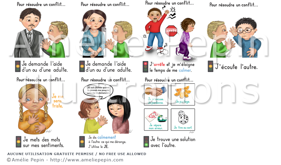 6 étapes illustrées pour résoudre un conflit.