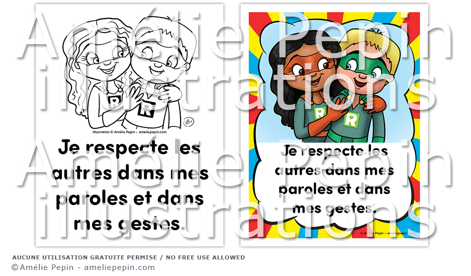Règle de classe illustrée avec des superhéros: "Je respecte les autres dans mes paroles et dans mes gestes."