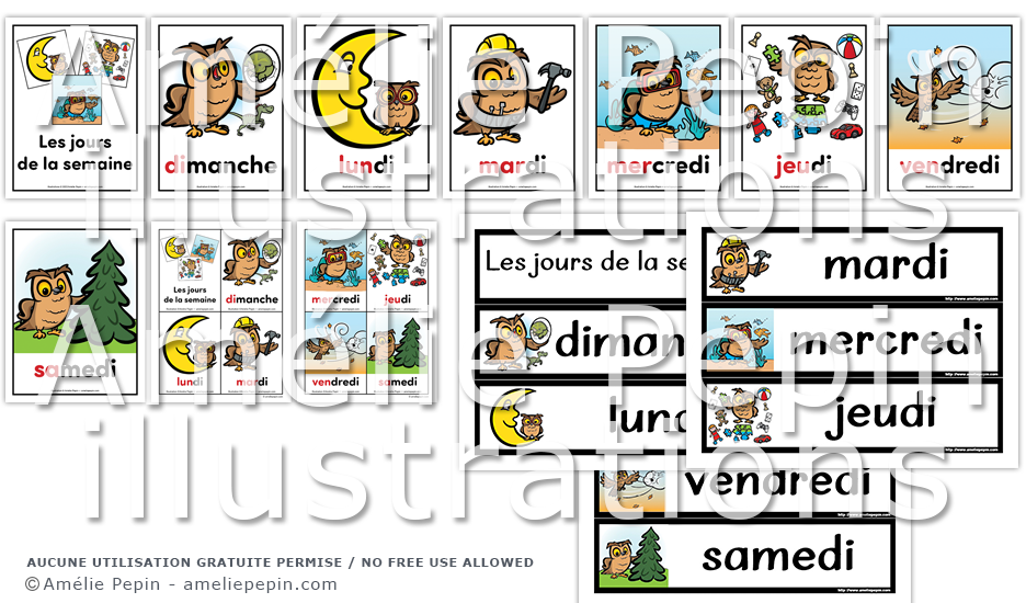Chaque jour de la semaine est représenté par un hibou avec un élément dont le son débute par la première syllabe du jour (DImanche, DInosaure).