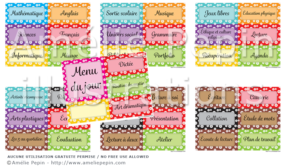 Les menus sont: mathématique, anglais, sciences, français, informatique, ménage, sortie scolaire, musique, univers social, grammaire, bibliothèque, portfolio, jeux libres, éducation physique, éthique et culture religieuse, lecture, récupération, agenda, activité récompense, récréation, arts plastiques, écriture, les 5 au quotidien, évaluation, invité spécial, lecture à soi, diner, présentation, lecture à deux, ateliers, causerie, étude de mots, écoute de lecture, plan de travail, dictée, routine du matin, art dramatique, récréation.