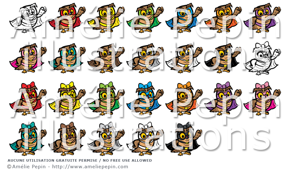 Ce dossier contient des images de hiboux (garçons et filles) en superhéros de différentes couleurs: rouge, jaune, vert, bleu, orange, violet, rose, turquoise, brun, gris, noir et blanc.