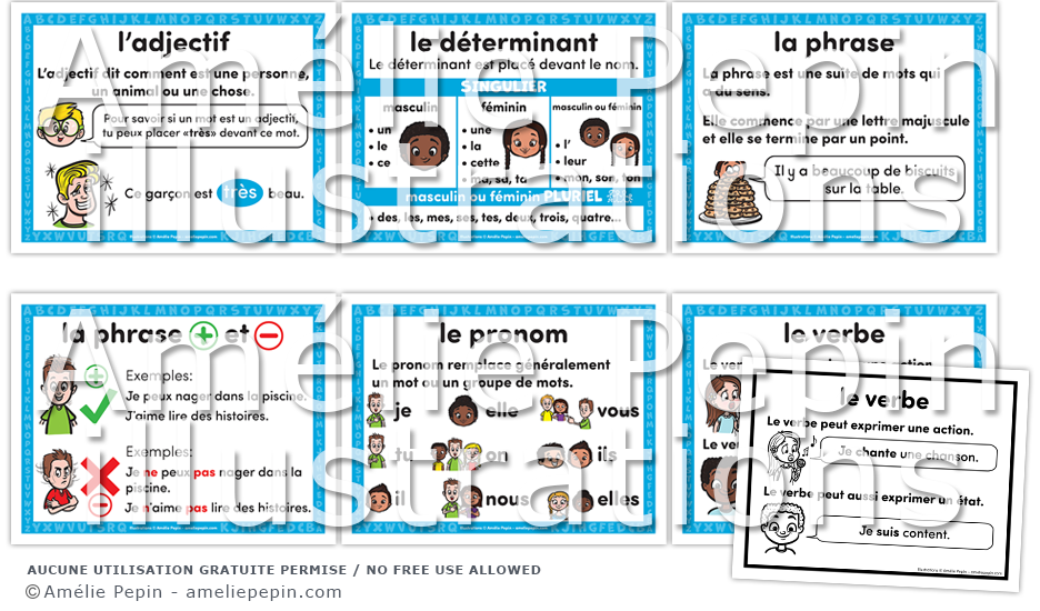 Le document contient six affiches: l'adjectif, le déterminant, le pronom, le verbe, la phrase, la phrase positive et négative.