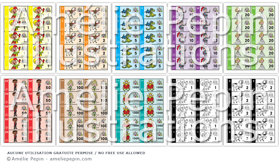 Ces documents contiennent les billets de 1$, 2$, 5$, 10$, 20$, 50$,100$ et 1000$. Sauvez de l'encre en imprimant la version en noir et blanc sur du papier teinté.