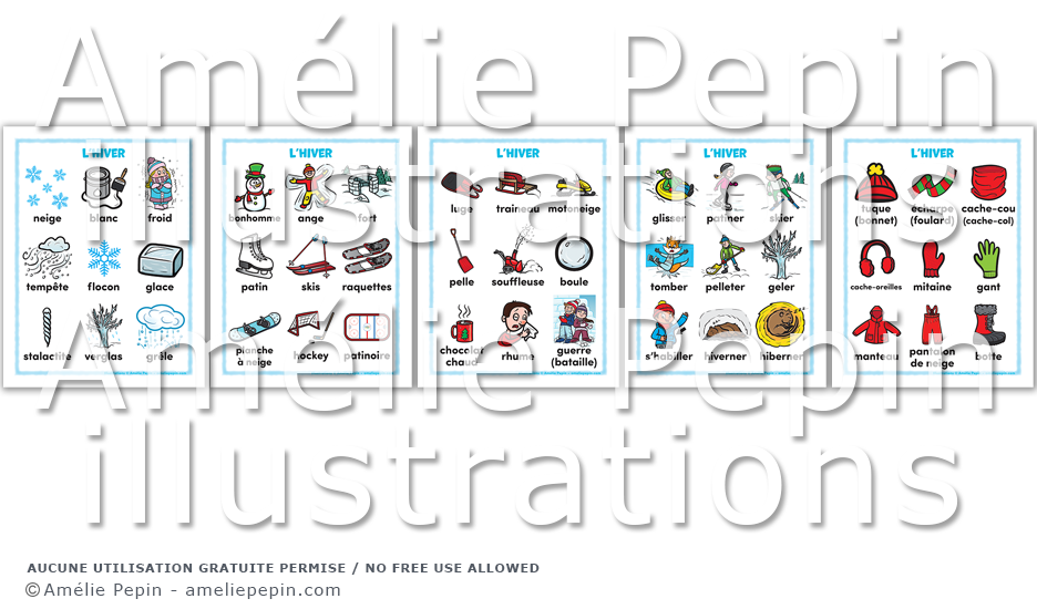 Les mots illustrés sont: neige, blanc, froid, tempête, flocon, glace, stalactite, verglas, grêle, bonhomme, ange, fort, patin, skis, raquettes, planche à neige, hockey, patinoire, luge, traineau, motoneige, pelle, souffleuse, boule, chocolat chaud, rhume, guerre (bataille), glisser, patiner, skier, pelleter, tomber, geler, s'habiller, hiverner, hiberner, tuque (bonnet), écharpe (foulard), cache-cou (cache-col), cache-oreilles, mitaine, gant, manteau, pantalon de neige, botte.