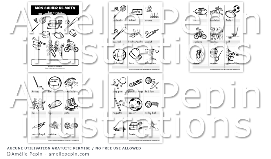 Utilisez ce document en tant que recueil de mots illustrés (dictionnaire) ou comme cahier d'écriture de mots sur le thème des sports. Les enfants peuvent colorier les dessins. Quatre versions sont incluses: sans lignes (rectangles pour écrire), avec lignes trottoirs, lignes doubles ou lignes calligraphiques.