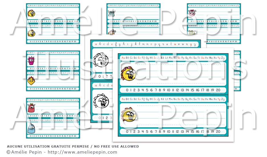 Chaque étiquette contient les lettres de l'alphabet en cursive avec les voyelles écrites en rouge, un trottoir pour écrire le prénom de l'enfant ainsi que les nombres de 0 à 20. Dans la seconde version, l'enfant peut colorier son monstre.