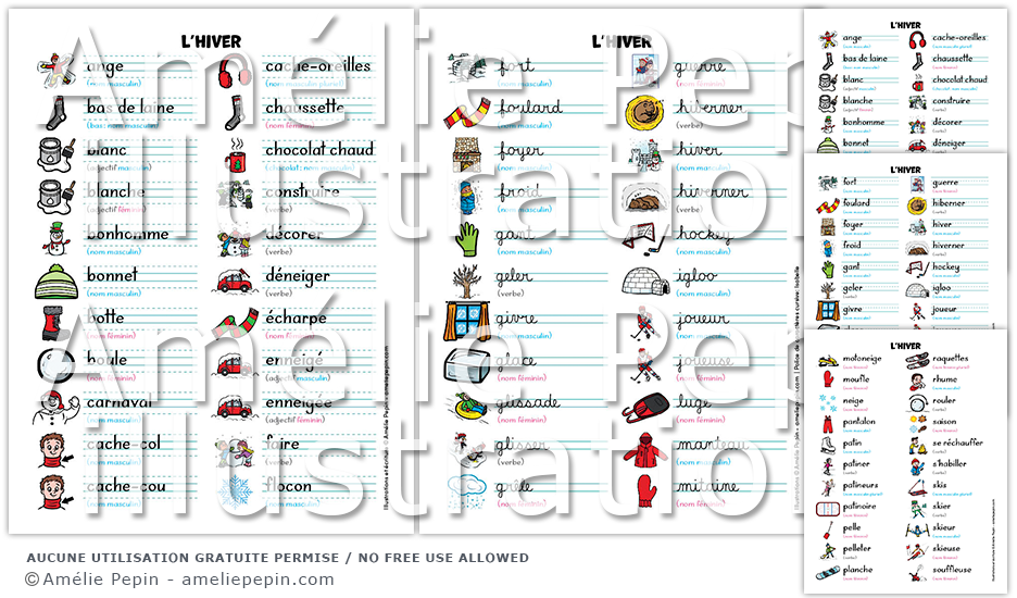 L'hiver - Liste de 66 mots illustrés (script et cursif)