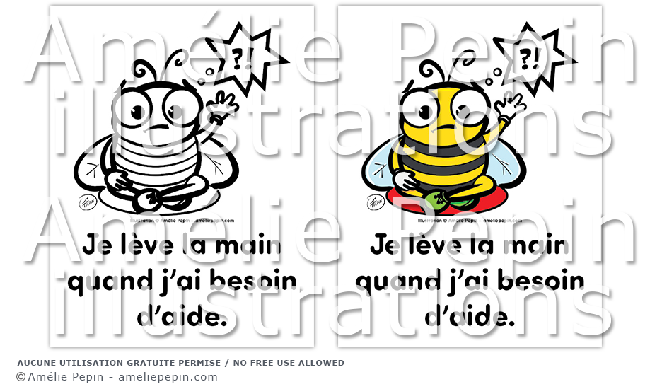Règle de classe illustrée avec une abeille: "Je lève la main quand j'ai besoin d'aide."