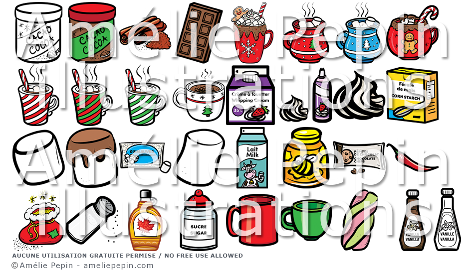 Le dossier contient: 5 modèles de chocolats chauds, du cacao, de la cannelle, une tablette de chocolat, de la crème, de la crème fouettée (x2), de la fécule de maïs, 2 modèles de guimauve, une guimauve trempée dans le chocolat, un sac de guimauves, du lait, du miel, un sac de pépites de chocolat, un piment, un sac de poudre magique, du sel, du sirop d'érable, du sucre, 2 tasses vides, une torsade de guimauve et de la vanille.