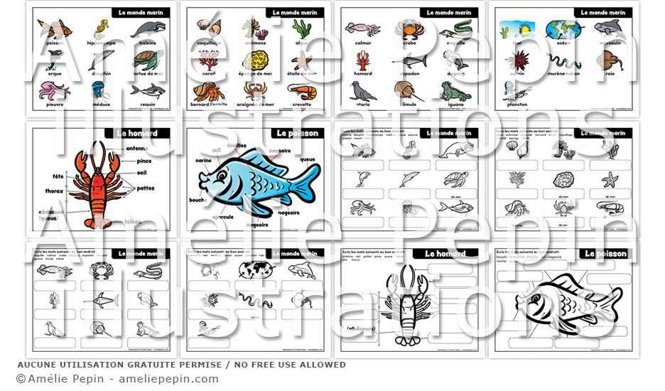 Imagier sur le thème du monde marin. Le dossier contient 6 affiches et 6 feuilles d'activités pour apprendre le vocabulaire en lien avec la mer et le monde marin. Dans les activités, l'enfant écrit les mots demandés au bon endroit.