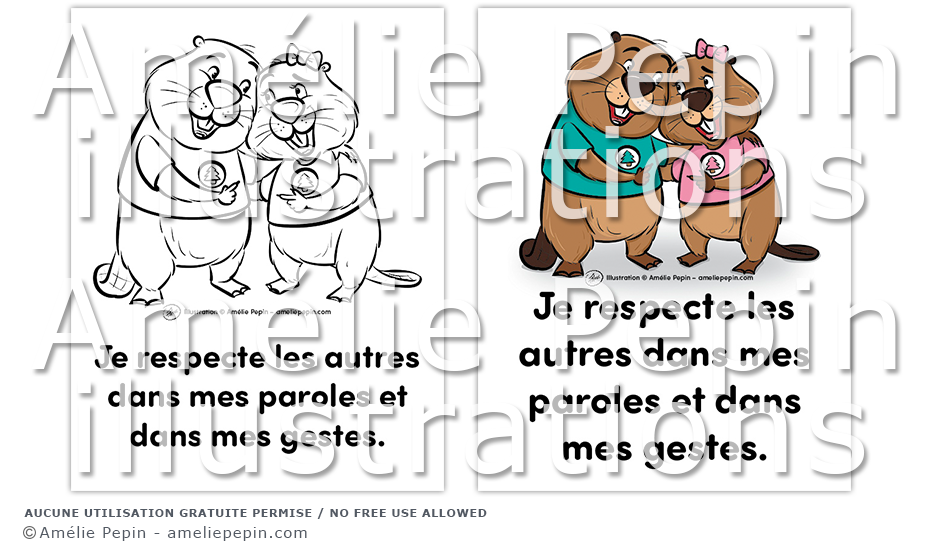 Règle de classe illustrée avec des castors: "Je respecte les autres dans mes paroles et dans mes gestes."
