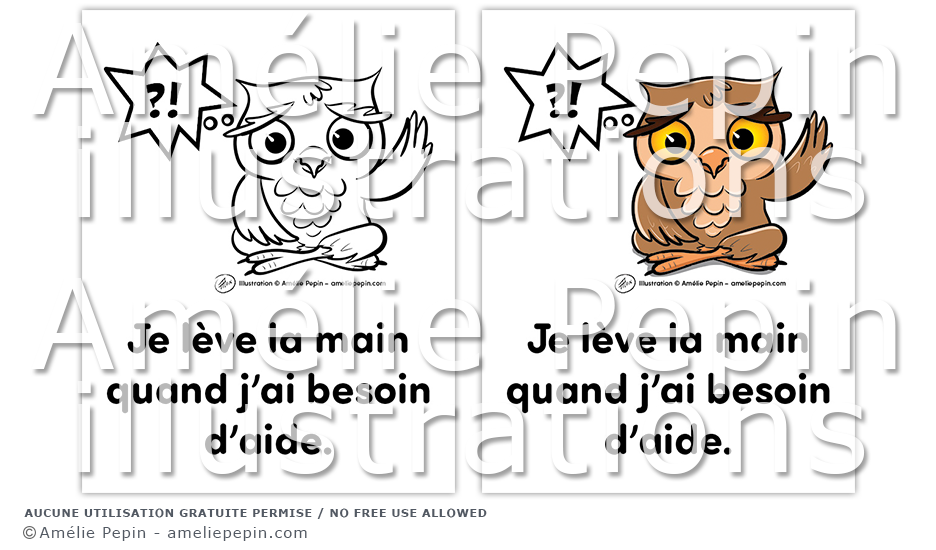 Règle de classe illustrée avec un hibou: "Je lève la main quand j'ai besoin d'aide."