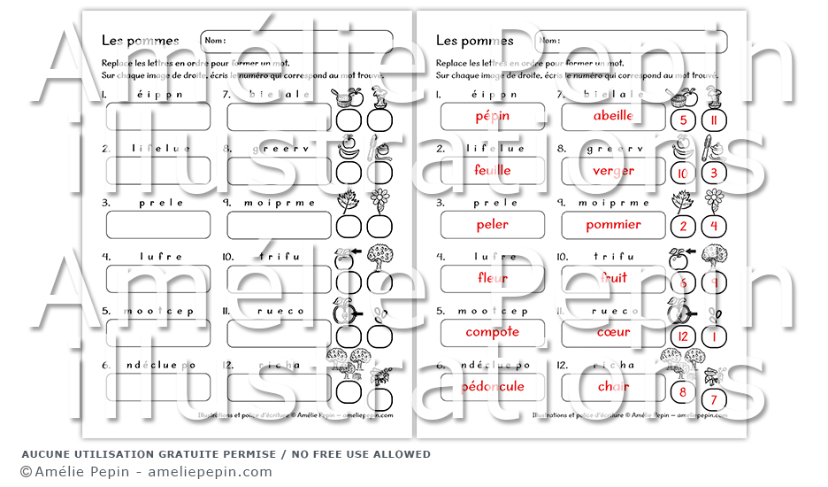 Dans cette activité, l'élève replace les lettres en ordre pour former les douze mots par page. Ensuite, il écrit les numéros qui correspondent aux mots trouvés sur les images de droite. Les thèmes exploités sont: les pommes, l'automne, l'hiver, le printemps, l'été, les animaux domestiques, les animaux marins, les pirates, le Moyen Âge et les animaux du zoo.