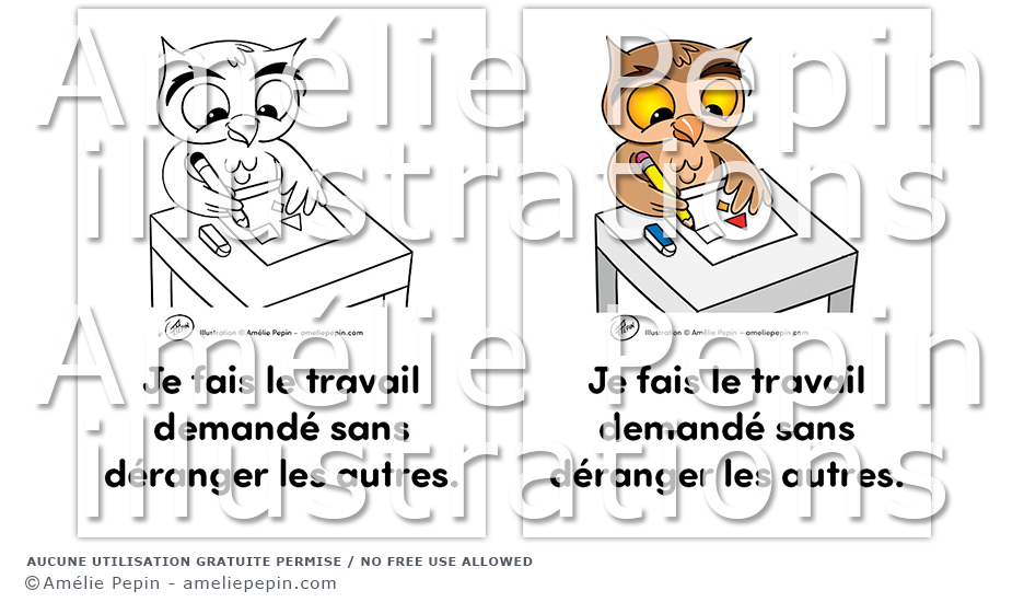 Règle de classe illustrée avec un hibou: "Je fais le travail demandé sans déranger les autres."