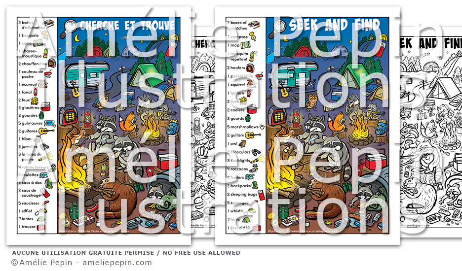 L'enfant cherche et trouve les éléments de la liste dans l'illustration. Les éléments à trouver sont illustrés pour aider l'enfant à apprendre leur nom. C'est un jeu qui développe le sens de l'observation, la concentration et le vocabulaire. L'enfant compte également les éléments jusqu'à sept. Ratons laveurs, écureuil, hibou, renard et loup sont autour du feu pour une belle nuit de camping. Une version en noir et blanc est incluse et n'attend qu'à être coloriée!